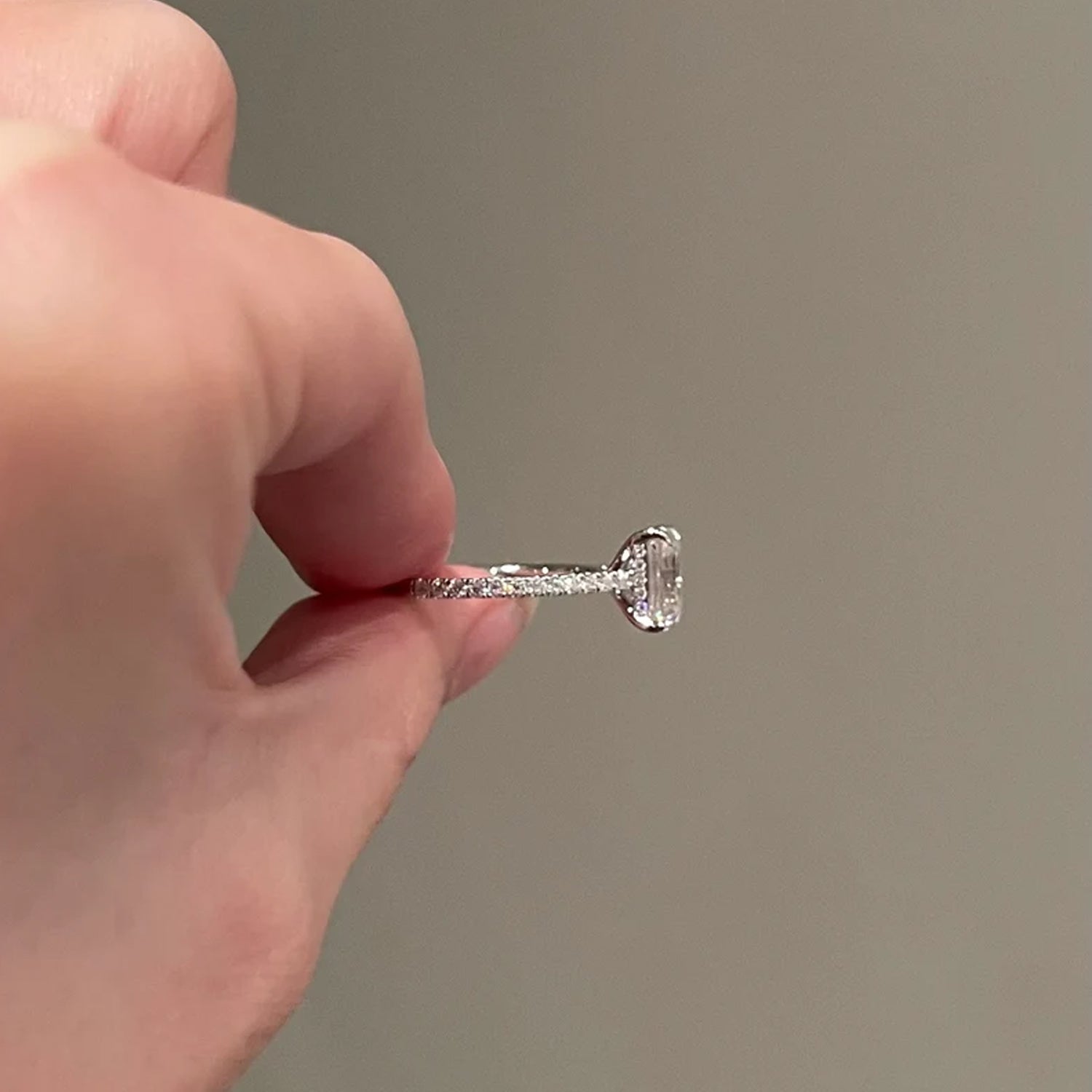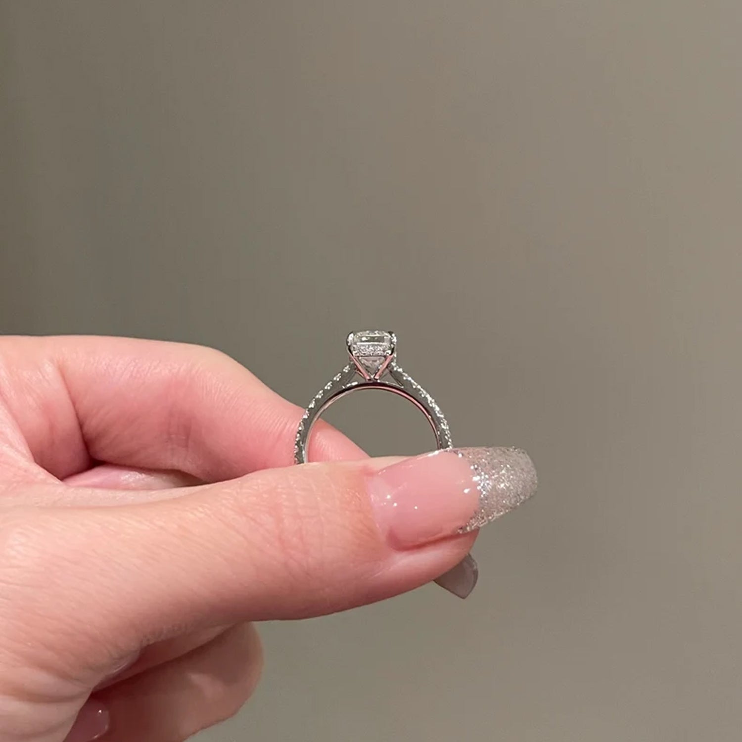 2 Carat Brilliant Emerald Cut Moissanite 4-Prong Hidden Halo Pavé Cathedral Engagement Ring, 925 Silver Ring